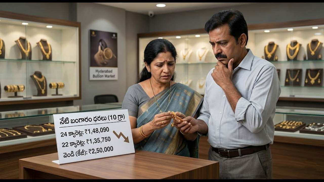 హైదరాబాద్ బులియన్ మార్కెట్లో బంగారం ధరలు ఆకాశాన్ని తాకుతున్నాయి. గత రెండు రోజులుగా చోటుచేసుకుంటున్న పరిణామాలు పసిడి ప్రియులకు గట్టి షాక్ ఇస్తున్నాయి. హైదరాబాద్ మార్కెట్లో గత రెండు రోజులుగా బంగారం ధరలు ఊహించని రీతిలో పెరిగాయి. కేవలం 48 గంటల వ్యవధిలోనే 24 క్యారెట్ల (శుద్ధమైన) బంగారం ధర రూ.3,540 మేర పెరగడం పెట్టుబడిదారులను సైతం ఆశ్చర్యానికి గురిచేస్తోంది. నేడు ఒక్కరోజే 10 గ్రాముల స్వచ్ఛమైన బంగారంపై రూ.2,510 పెరగడంతో, ప్రస్తుతం దాని ధర రూ.1,48,090కి చేరింది. అదేవిధంగా, ఆభరణాల తయారీలో వాడే 22 క్యారెట్ల బంగారం ధర కూడా రూ.2,300 ఎగబాకి రూ.1,35,750 వద్ద కొనసాగుతోంది. ఈ భారీ పెరుగుదల మధ్యతరగతి ప్రజల కొనుగోలు శక్తిపై తీవ్ర ప్రభావం చూపే అవకాశం ఉంది.