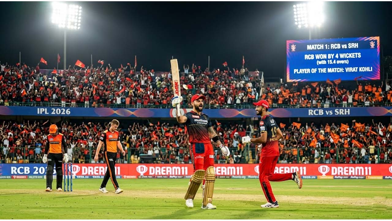 ఐపీఎల్ 2026 సీజన్ ఆరంభ మ్యాచ్లోనే రాయల్ ఛాలెంజర్స్ బెంగళూరు (RCB) సంచలన విజయాన్ని నమోదు చేసింది. సన్రైజర్స్ హైదరాబాద్ (SRH) నిర్దేశించిన భారీ లక్ష్యాన్ని ఆర్సీబీ బ్యాటర్లు ఊహించని వేగంతో ఛేదించారు. సన్రైజర్స్ హైదరాబాద్ నిర్దేశించిన 202 పరుగుల భారీ లక్ష్యాన్ని ఆర్సీబీ కేవలం 15.4 ఓవర్లలోనే ఛేదించి పాయింట్ల పట్టికలో బోణీ కొట్టింది. హోమ్ గ్రౌండ్ అయిన చిన్నస్వామి స్టేడియంలో బెంగళూరు బ్యాటర్లు ఆరంభం నుంచే ఎస్ఆర్హెచ్ బౌలర్లపై విరుచుకుపడ్డారు. ఏ దశలోనూ లక్ష్యం కష్టమనిపించకుండా, టి20 క్రికెట్ చరిత్రలో అత్యంత వేగవంతమైన ఛేదనల్లో ఒకటిగా ఈ మ్యాచ్ నిలిచిపోయింది. ఈ విజయంతో ఆర్సీబీ తన సొంత గడ్డపై అభిమానులకు అసలైన క్రికెట్ వినోదాన్ని అందించింది.